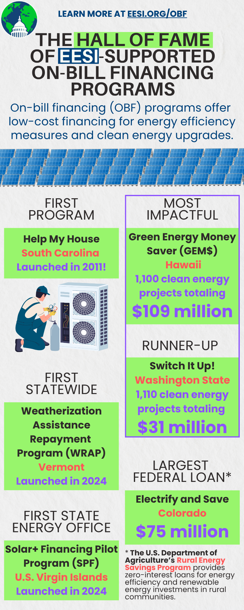 At the same time, EESI was active on Capitol Hill, working with champions and appropriators to provide annual funding for RESP. RESP is good value for taxpayers. Each dollar approved by Congress pays for a credit subsidy and is leveraged by up to 10 times by USDA. EESI is the leader of a coalition of advocates who ensure that policymakers learn about RESP success stories from South Carolina, Hawaii, and other states and understand the potential for rural electric co-ops to deliver savings, comfort, and other benefits to households by offering OBF programs.