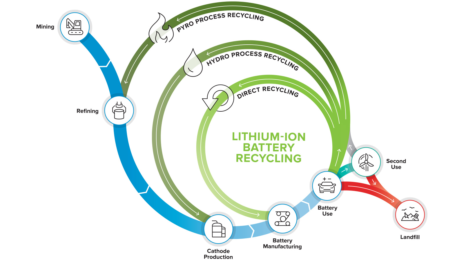 Lithium-ion battery recycling, particularly of EV batteries, presents significant opportunities. Battery recycling could reduce demand for mined lithium, nickel, and cobalt by around 10%. Despite this potential, fewer than 15% of U.S. lithium-ion batteries are recycled due to inefficient and inconsistent collection systems and limited recycling infrastructure.
