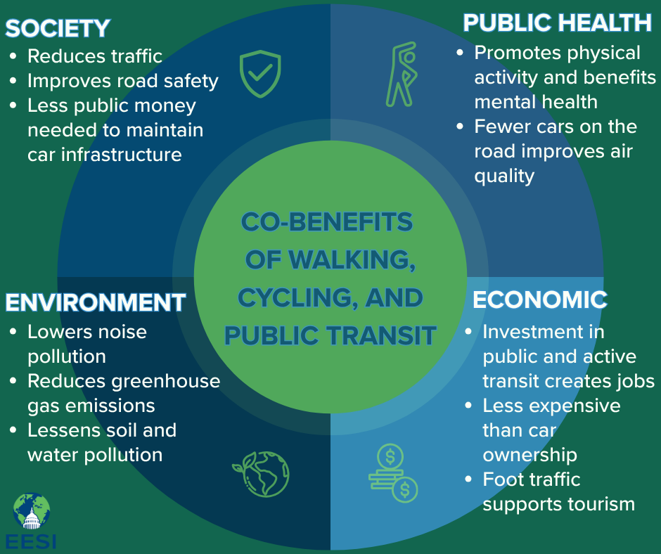 There are significant opportunities to reduce carbon emissions and pollution from transportation by switching to more low- or no-emissions transportation modes like transit and biking, electrification, and increasing efficiency through changes in design and operation. In addition to addressing climate change, these efforts also improve public health, increase economic activity, and reduce noise pollution. There are also efforts to increase the resilience of transportation infrastructure to the impacts of climate change. From coastal rail lines experiencing severe erosion due to sea level rise and stronger storms to airports reducing the use of runways during extreme heat events, every part of the transportation sector needs to adapt to climate change in order to keep systems safe and running.
