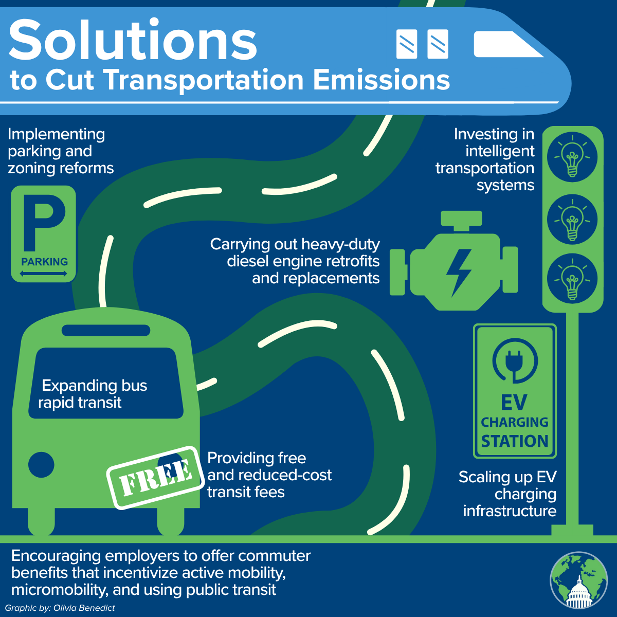 There are numerous pathways to decarbonize the transportation sector while also achieving economic gains, improved public health outcomes, and increased resilience in the face of climate impacts. The U.S. Environmental Protection Agency emphasizes fuel switching, increasing efficiency, reducing travel time, and considering different modes of transportation. In 2025, the U.S. Department of Transportation published a comprehensive report, Climate Strategies that Work, based on the U.S. National Blueprint for Transportation Decarbonization. While federal engagement on these strategies would scale up and accelerate the transition to a decarbonized sector, the private sector and subnational governments can also implement these solutions. Some of the recommended strategies are: